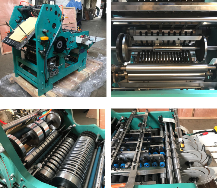 Take the paper which has been cut outside onto the paper table of this machine, paper can be automatic feeding from bottom and the machine  needn’t stop. Via the first folding, paste glue(two lines of glue),and second folding. Then folding the bottom flap and tongue flap, finish it. This machine with the counter.